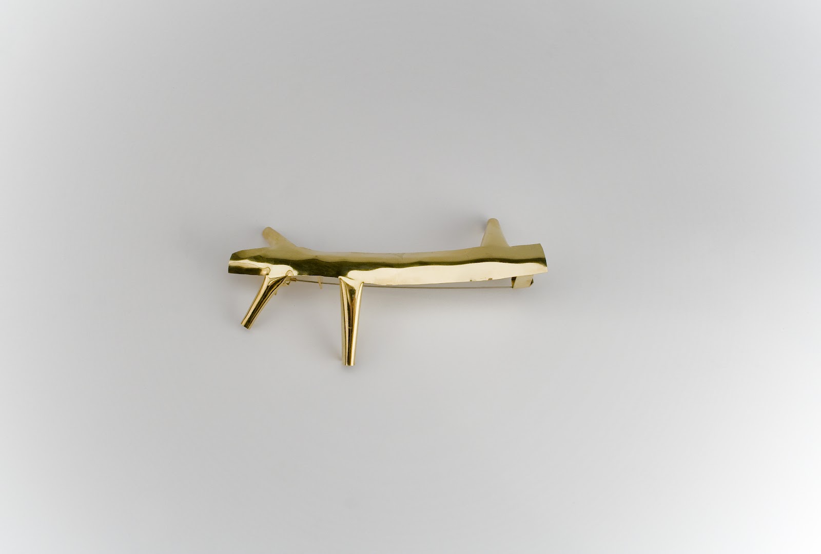 Jade Drakes and her dogs – Brooch, electroformed copper. Gold plated